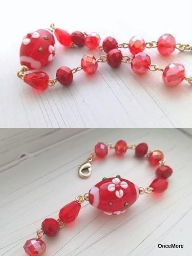 8ミリ大のボタンカットのガラスはオーロラ加工のある明るめの赤とマットカラーを混在させ明暗をつけました。