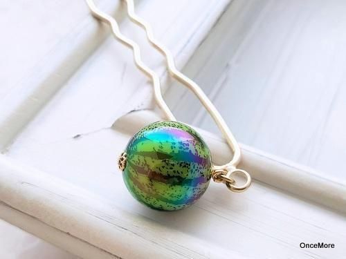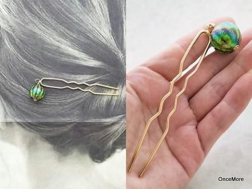スイカを模した大玉ビーズを二股かんざし金具に下げました。