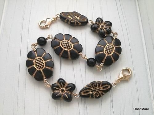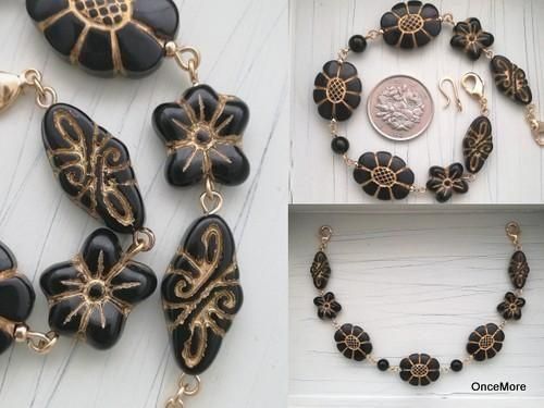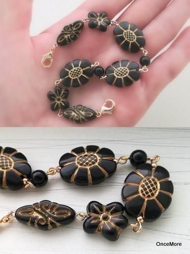 オーバルの平たいお花ビーズをメインに黒×ゴールドで統一した羽織紐です。
