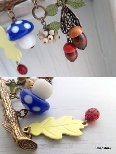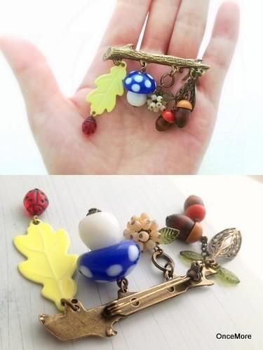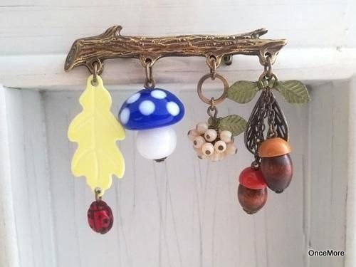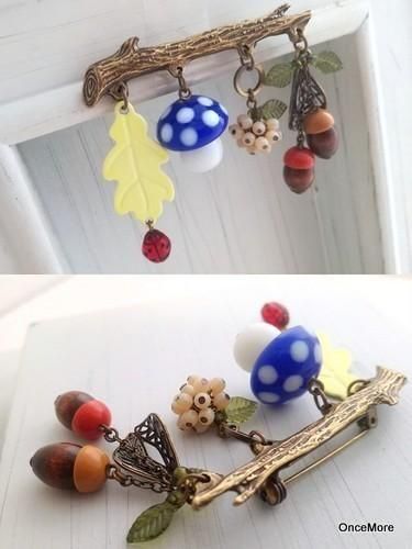 【現品限り】きのこ&どんぐりの小枝ピンブローチ