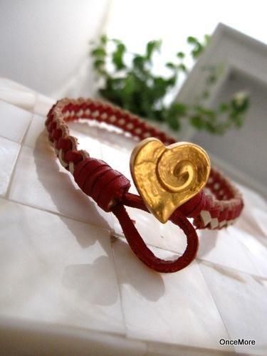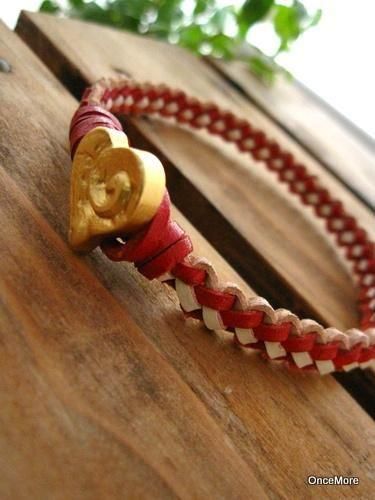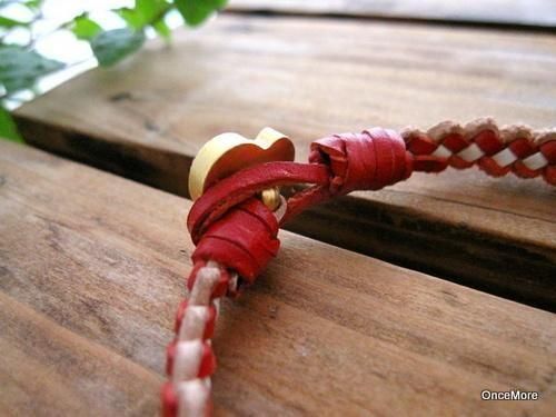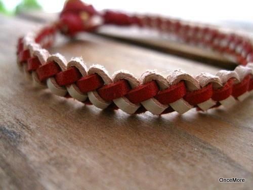 2ミリ幅のレッドとホワイトの本革コードをくさり結びで丁寧に編み込んだブレスレットです。