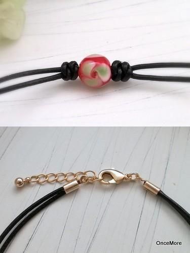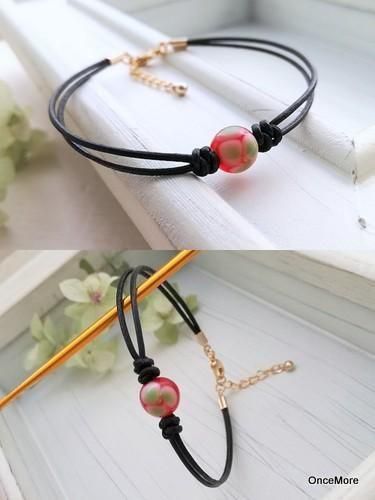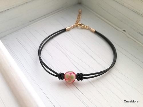 赤地に黄緑色の花柄とんぼ玉を黒の革コードに通したシンプルなブレスレット。