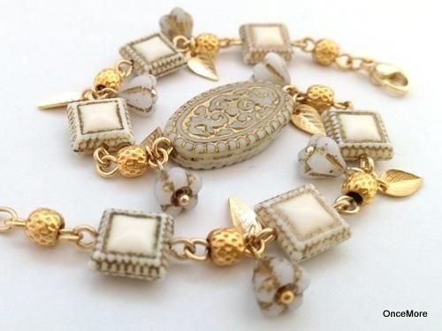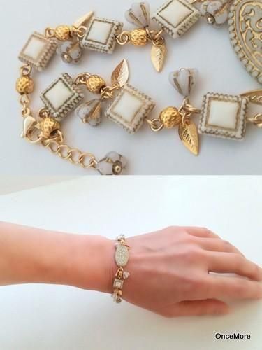 オフホワイトの地にマットゴールドの装飾があるスクエアビーズはどこかレトロ感を漂わせて。