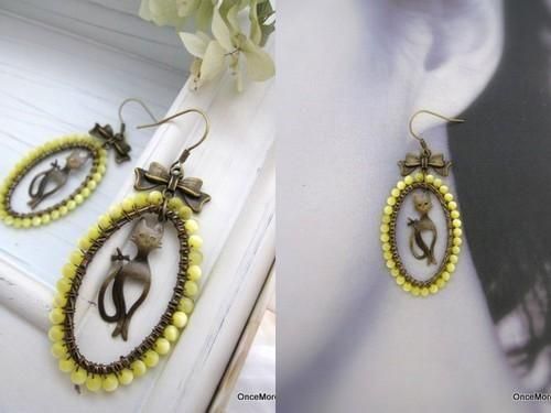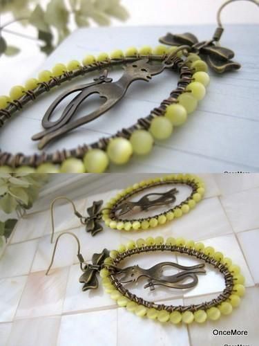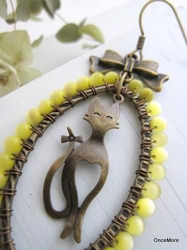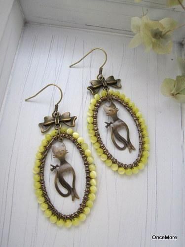 イエローのキャッツアイビーズを楕円のフレームにアーティスティックワイヤーで巻き付けました。