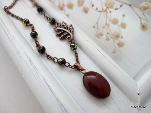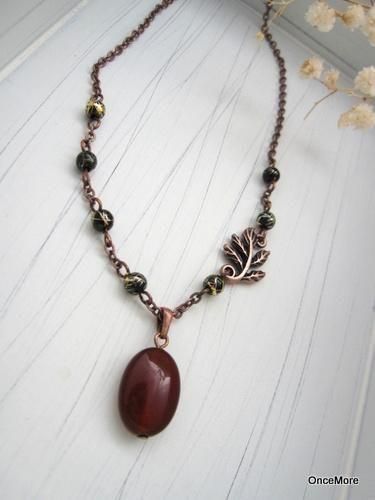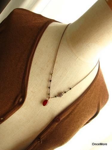 オーバル型のレッドメノウをペンダントヘッドに用いたアンティークカラーのネックレス。