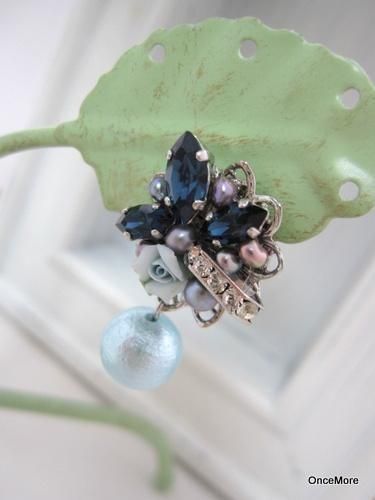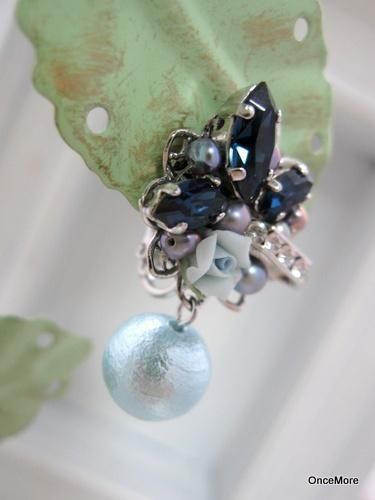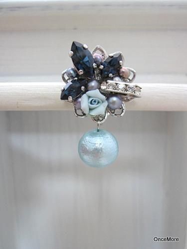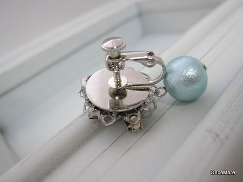 ブルー系で統一したお花モチーフとコットンパールのイヤリング。