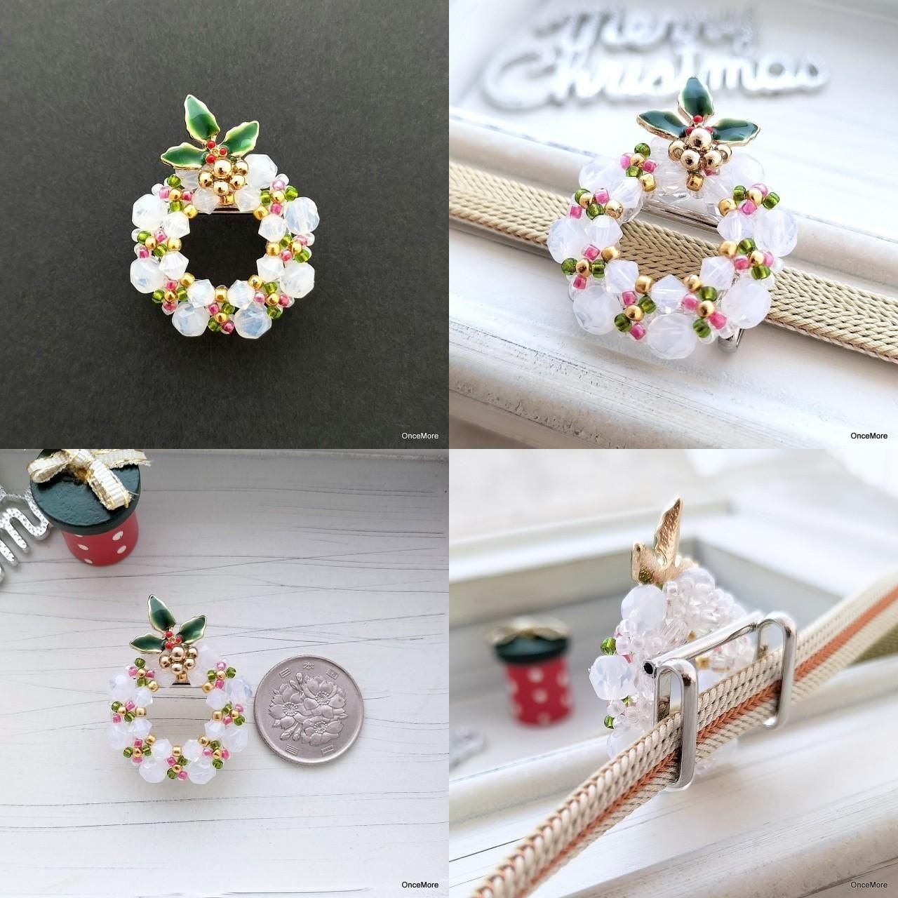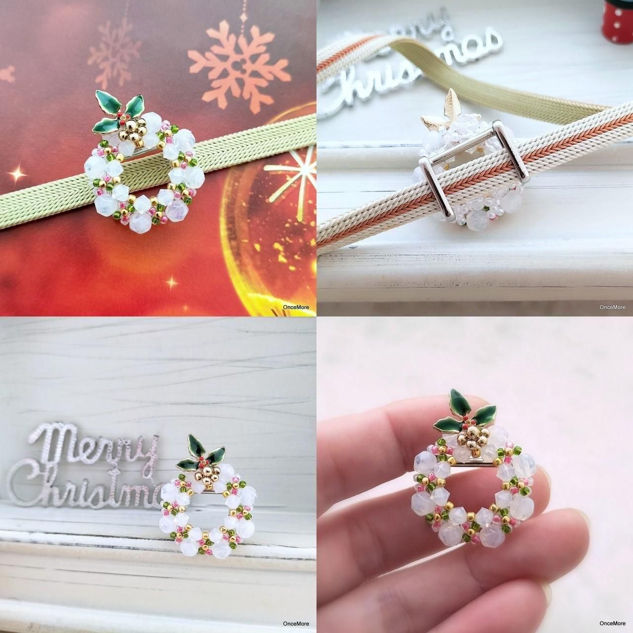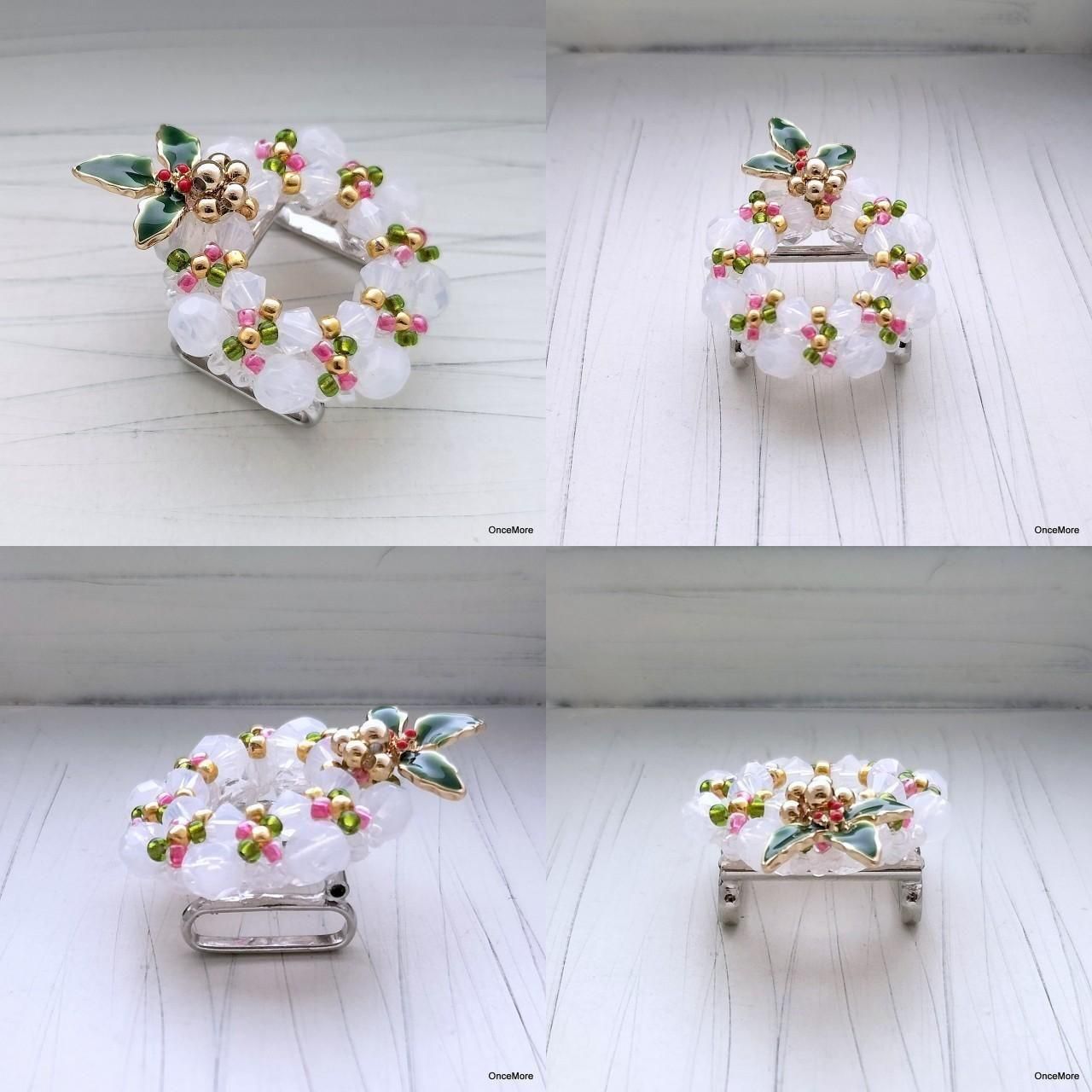 ホワイト(乳白色)の本体にピンク・黄緑・ゴールドのシードビーズをアクセントにしたクリスマスリースの帯留め。